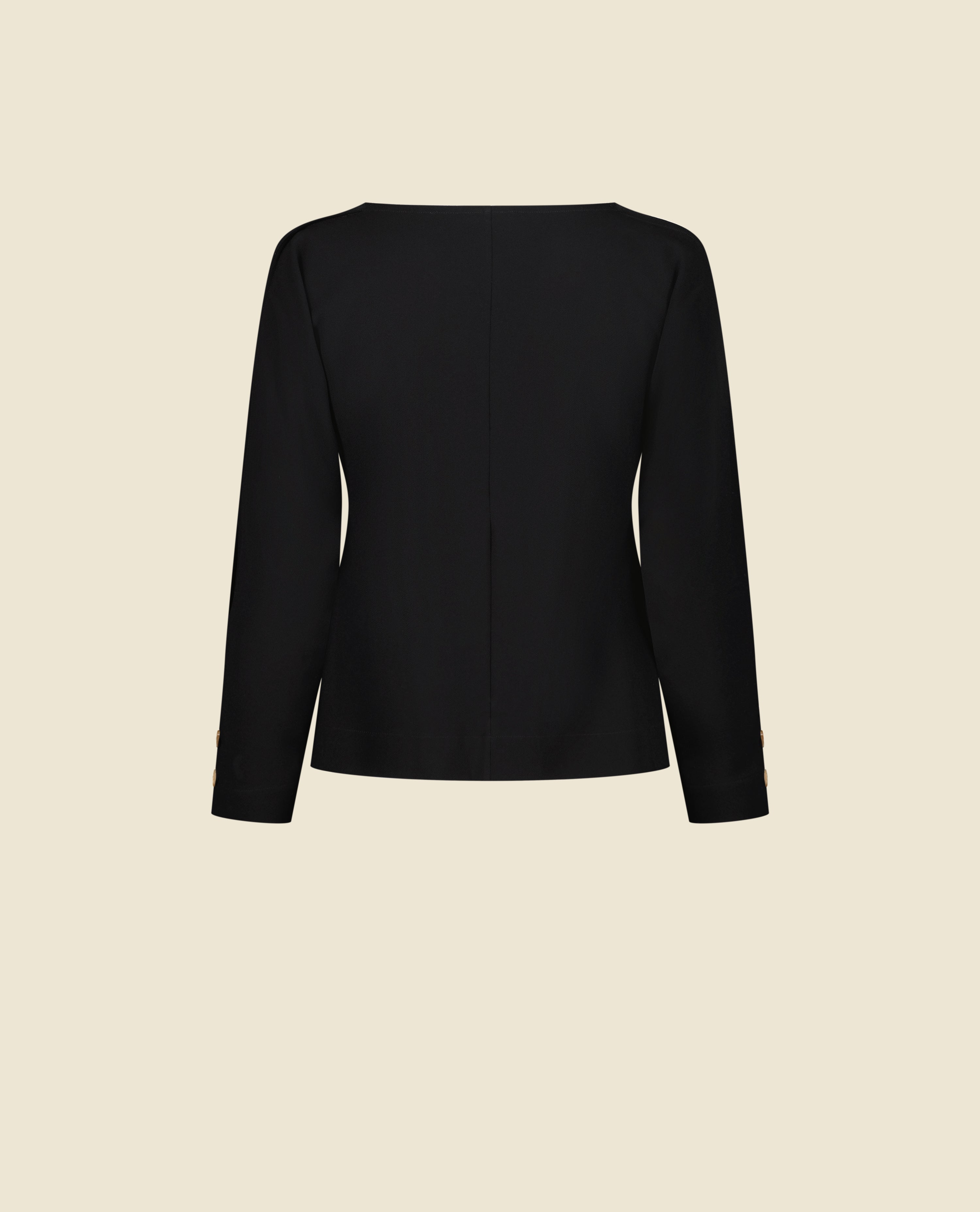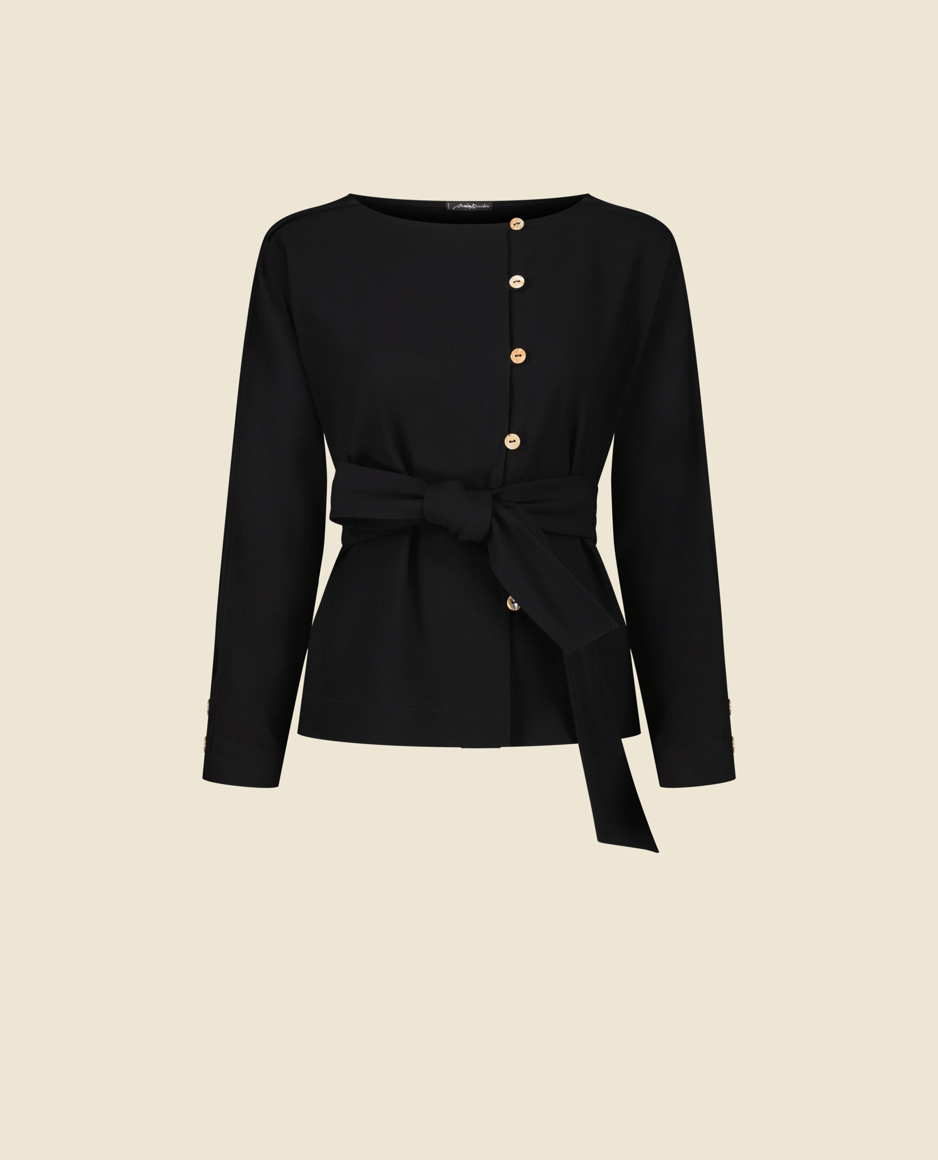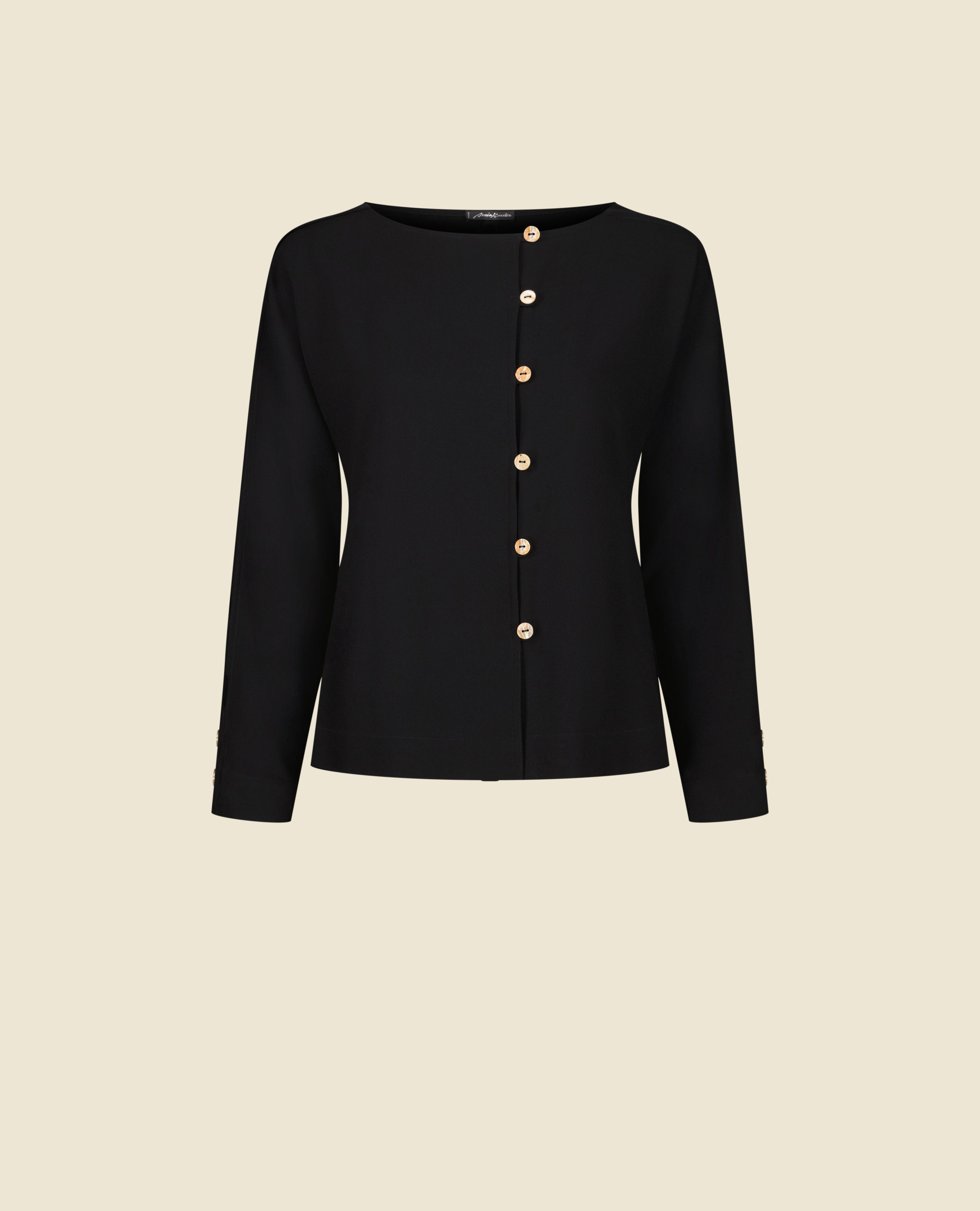 The Mycènes blouse reinvents the codes of the classic shirt through bold proportions. Its kimono sleeves bring both elegance and comfort, while the fitted cuffs lend subtle definition to its fluid silhouette. The front button placket, finished with fabric loops, enhances its minimalist sophistication.