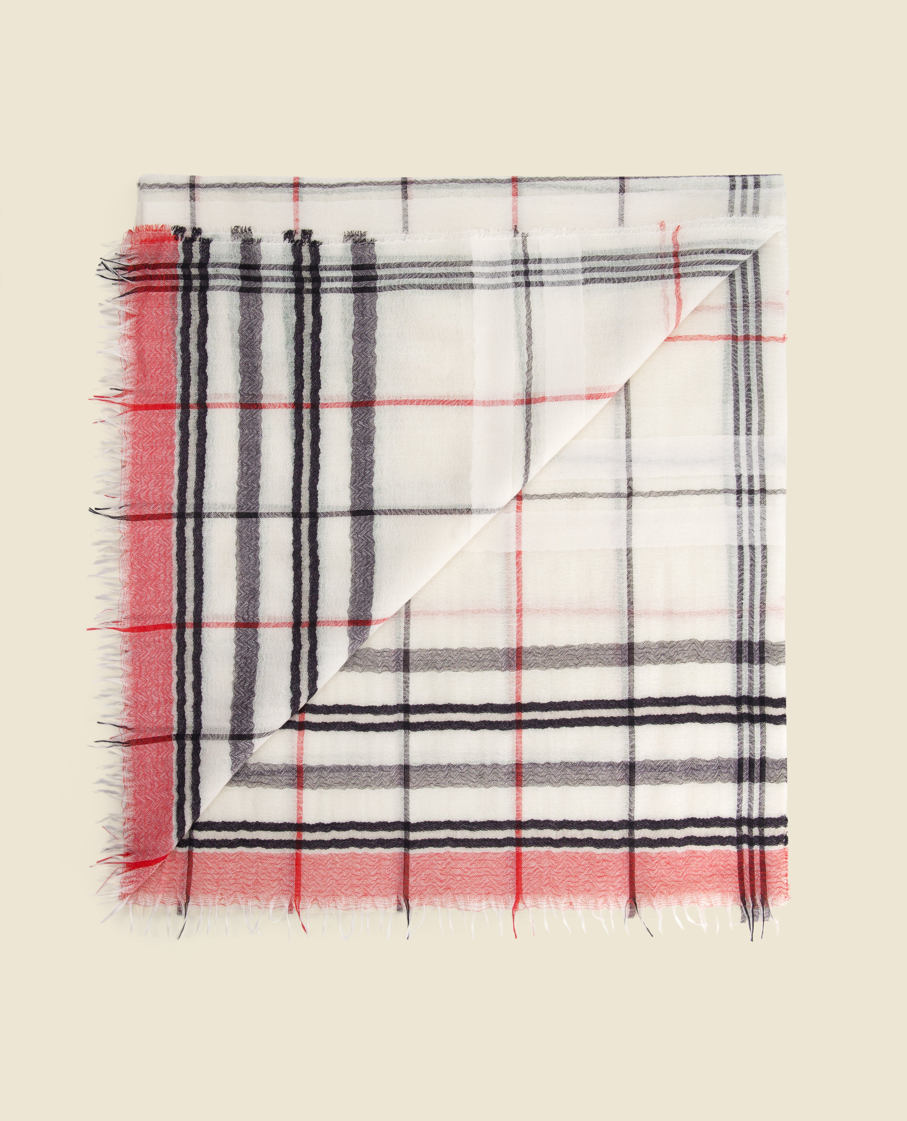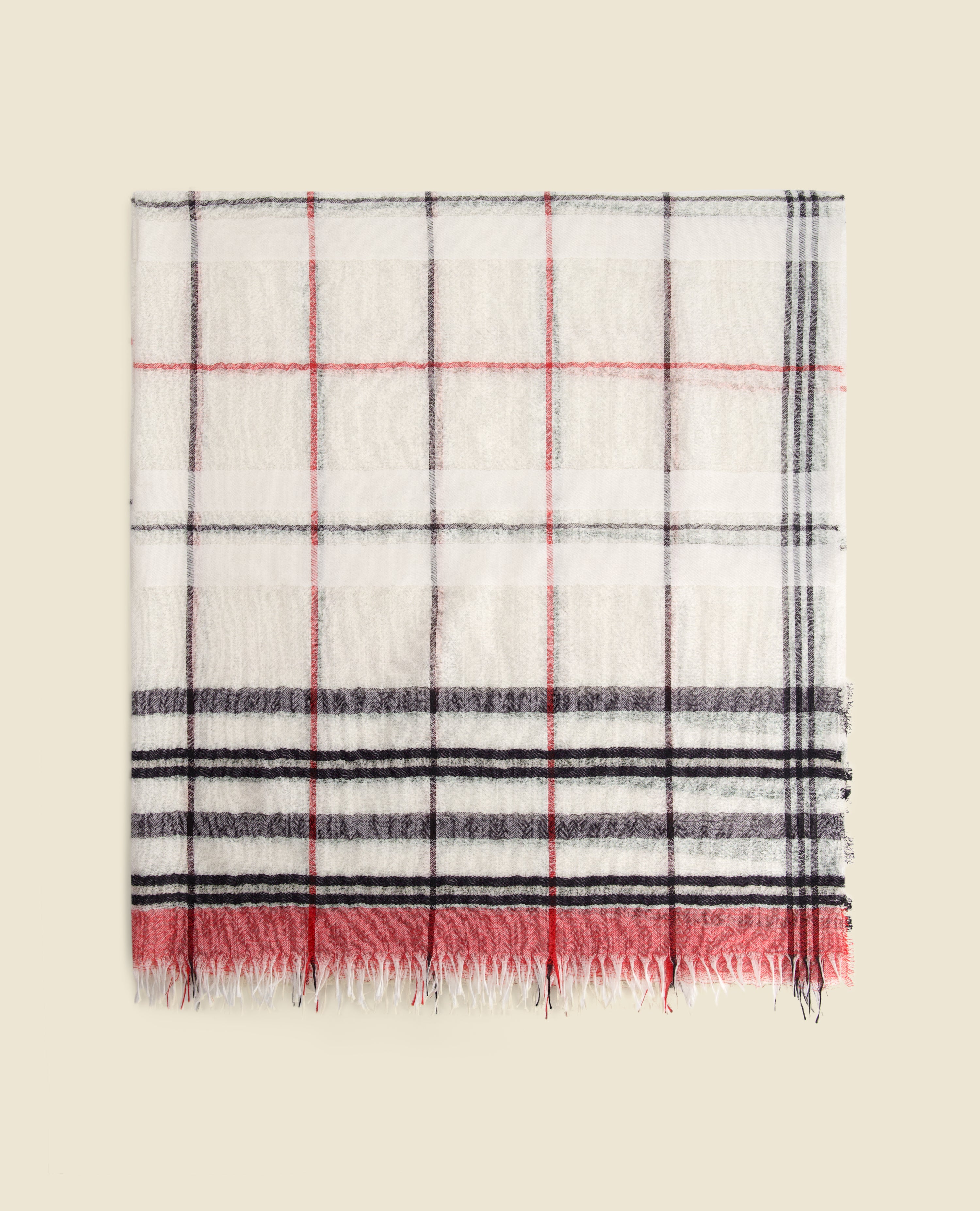 Crafted from cashmere and silk, this stole offers a silky touch and absolute softness. The multicolored checkerboard pattern adds a fresh note to this blend of noble fibers, ensuring lightness and fluidity. The combination of these two fibers guarantees exceptional softness, unmatched lightness, and a perfect drape.