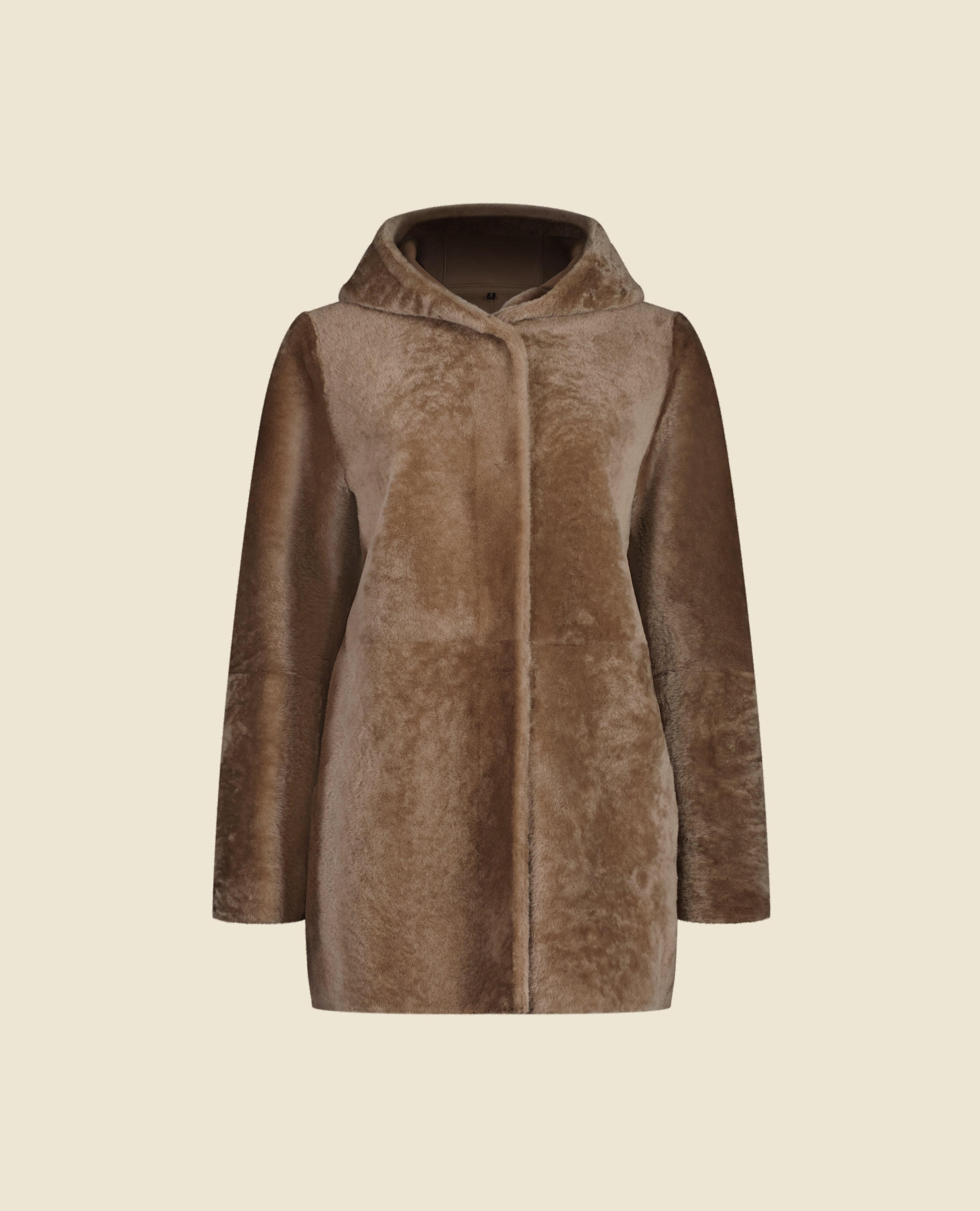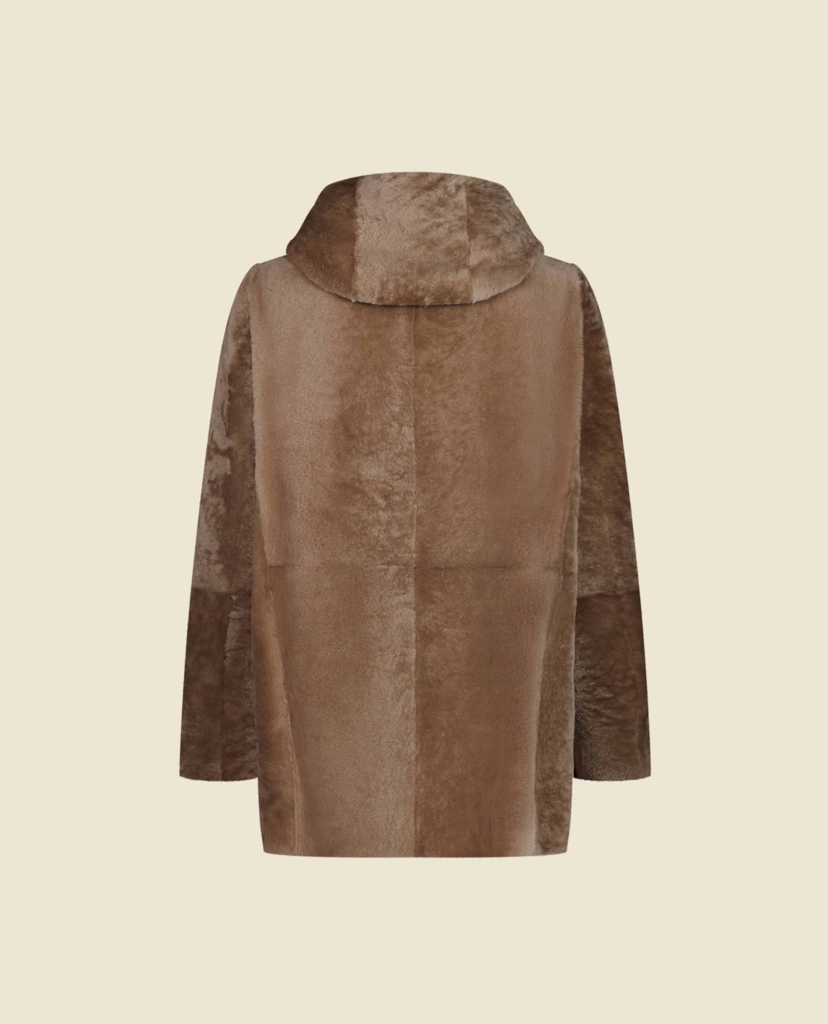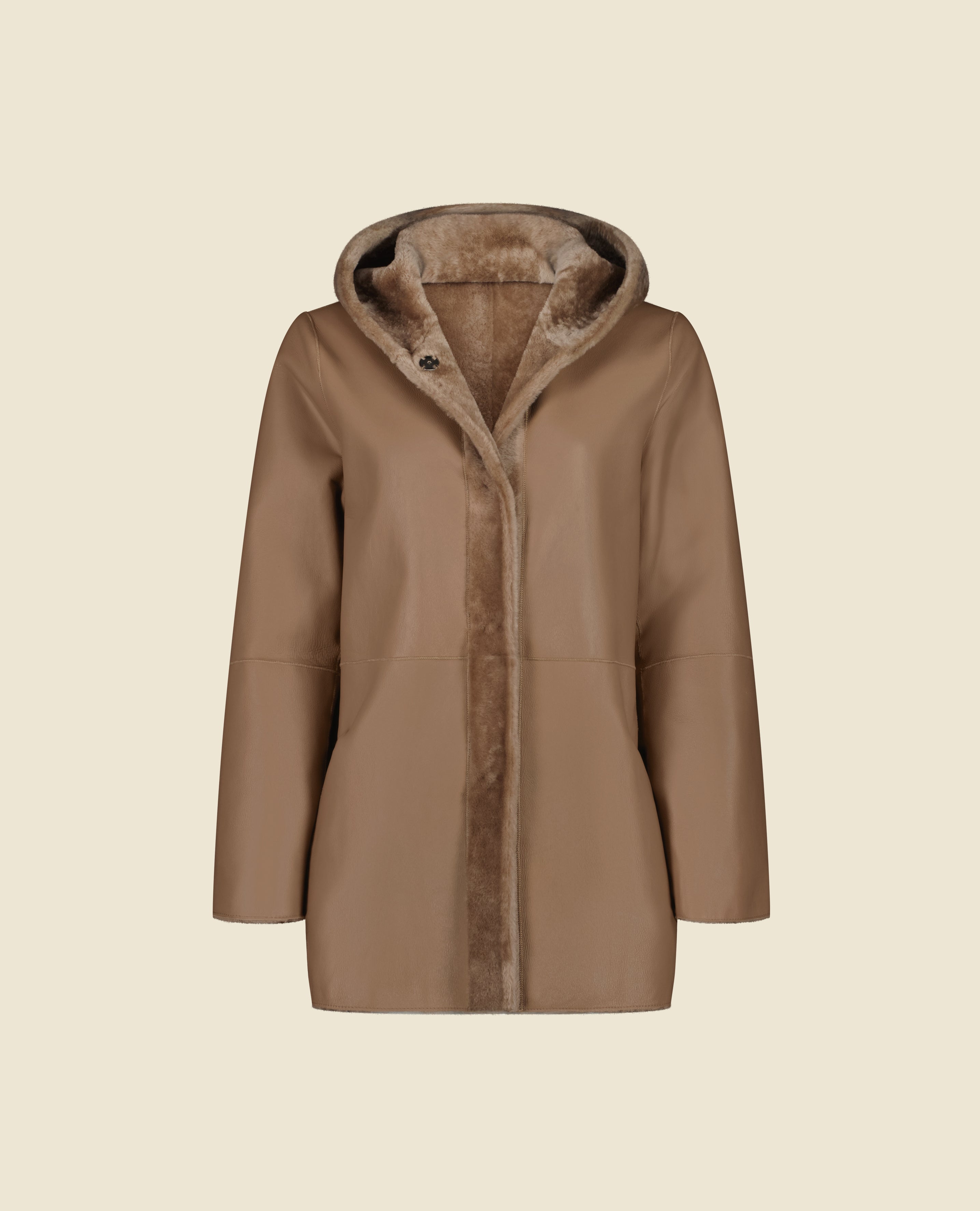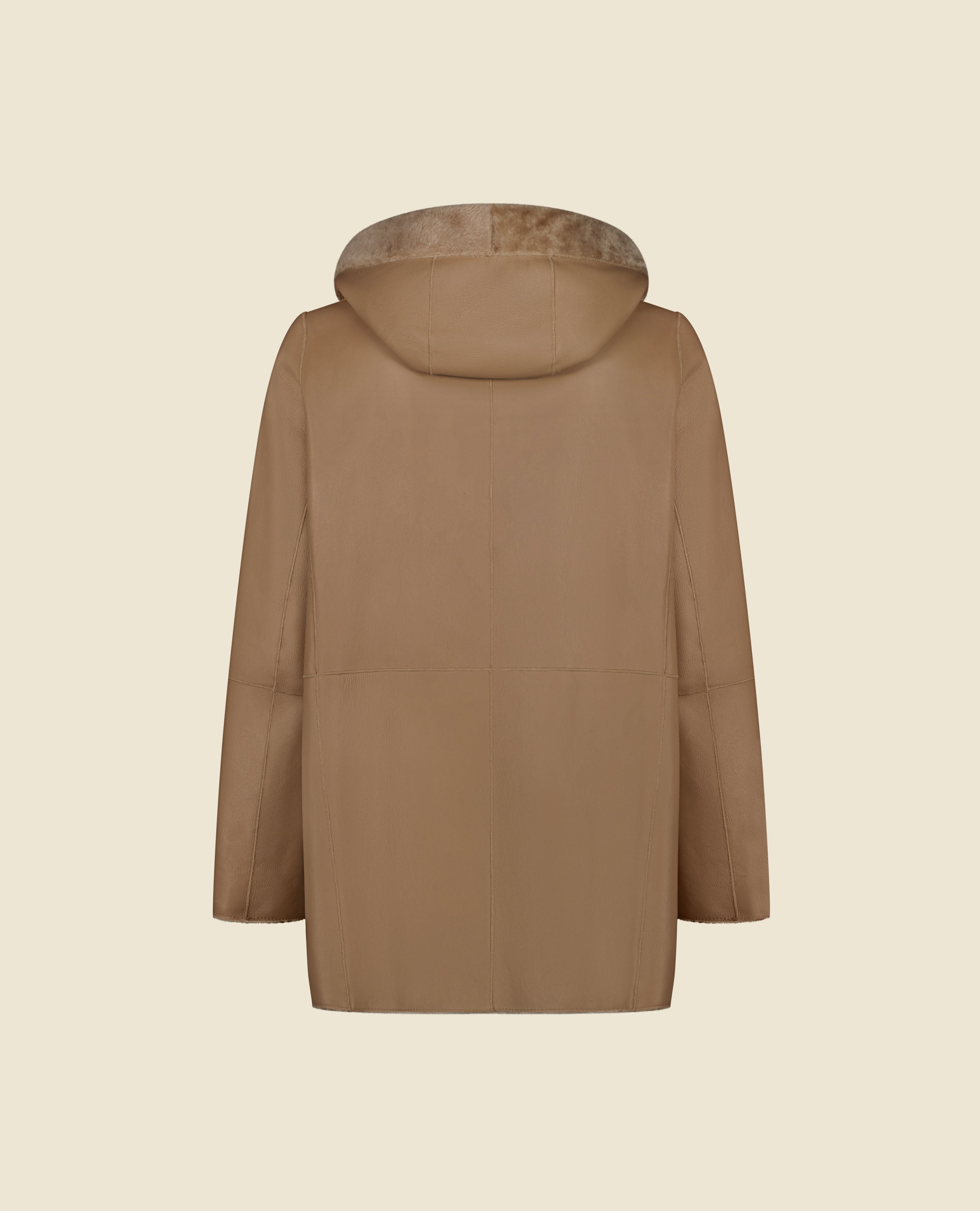 Crafted in luxurious shearling, the reversible Wilson coat features a hidden snap-button closure. Its straight silhouette and hood embody a refined sport-chic look. Designed for versatility, it adapts effortlessly to the seasons — wear the leather side out in milder weather, and the fur side in when temperatures drop.
