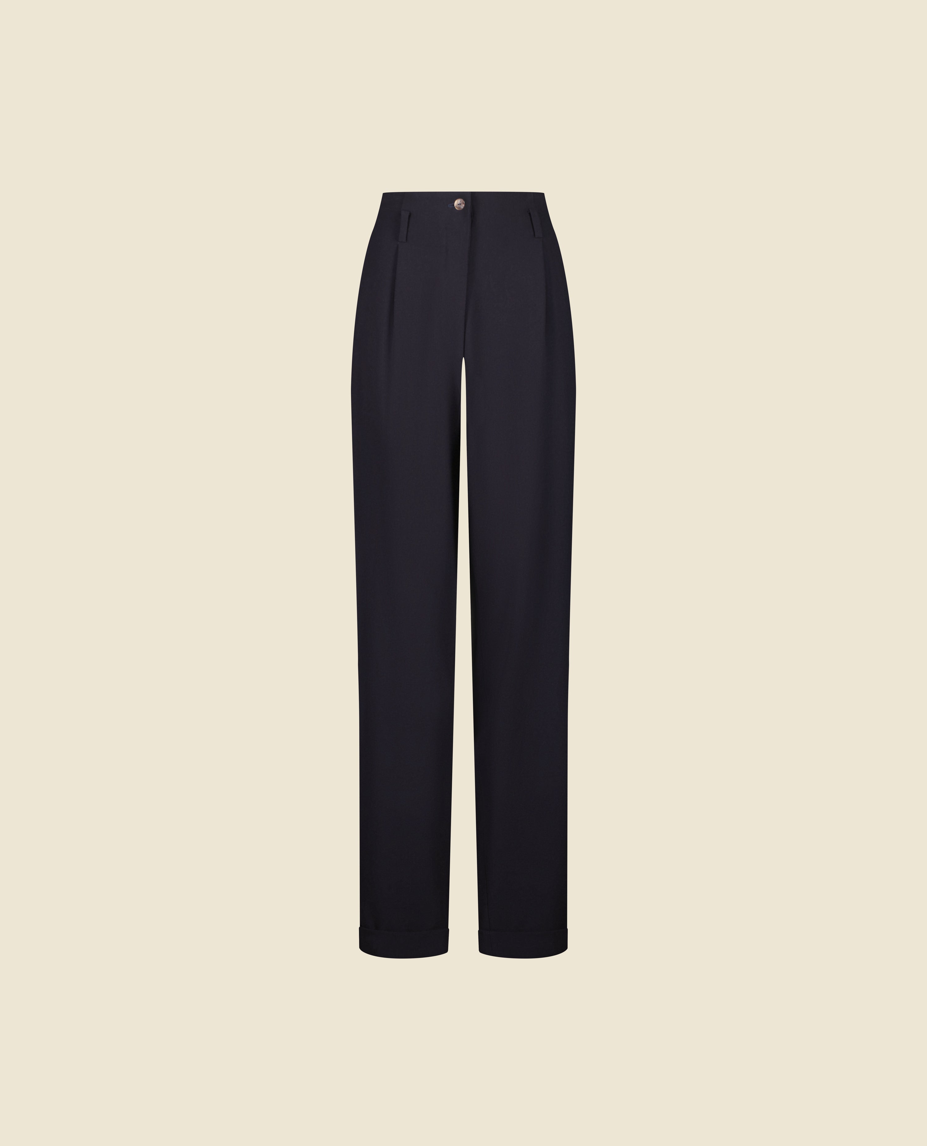 The 178 trousers are high-waisted tailored pants with a tapered leg, crafted from wool crepe. The waistband is adjustable with side tabs for a precise fit.