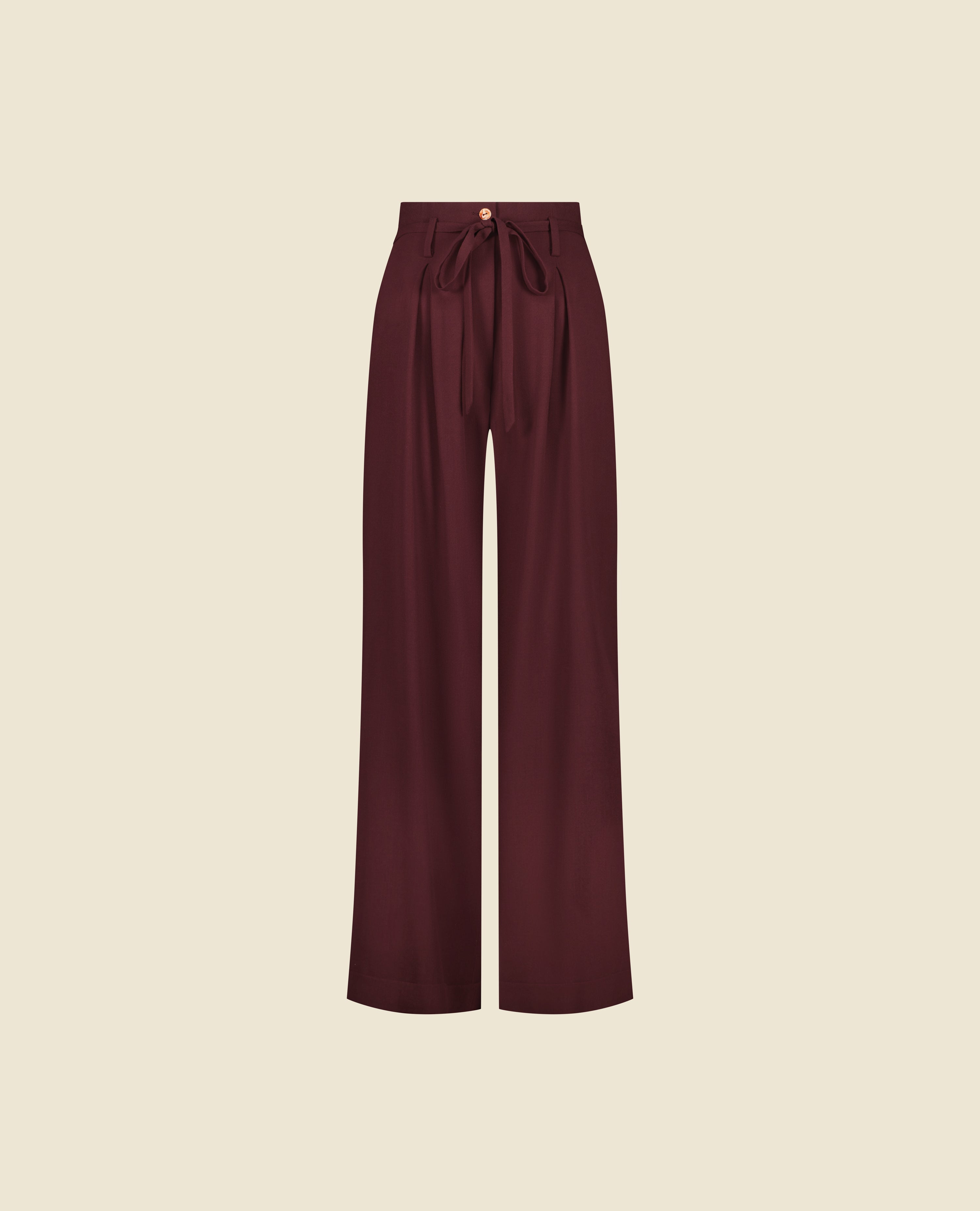The Tie Waist trousers are a tailored style with a high structured waistband and wide, fluid legs. The waist can be adjusted using two ties that cross at the back and knot at the front.