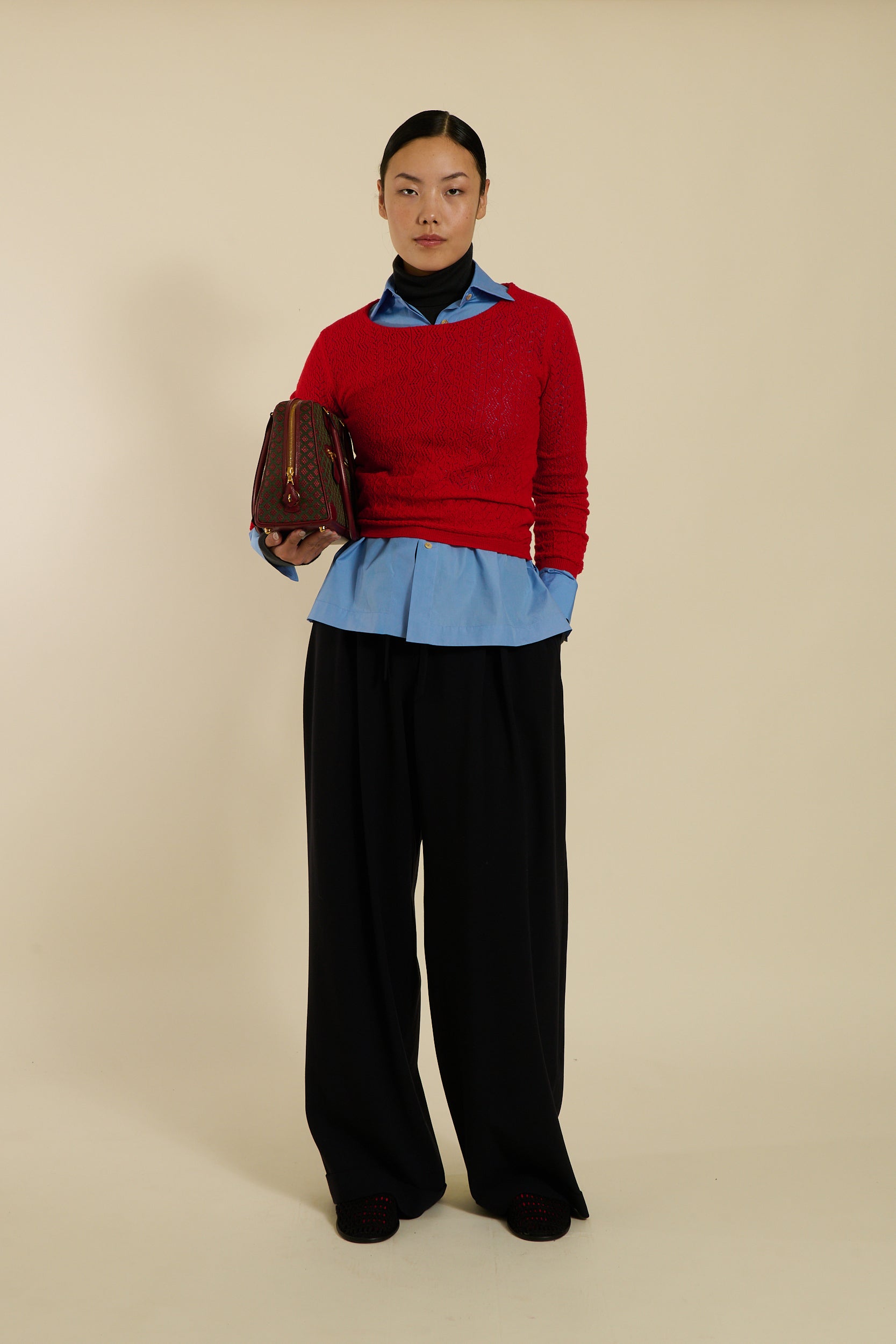 The fabric of this piece has been selected with the utmost care and requires delicate handling. Avoid overloading it to preserve its original shape. Keep away from prolonged contact with cosmetics, perfumes, chemicals, or materials that may cause color transfer. Avoid extended exposure to direct sunlight, humidity, and heat. Do not use soap or solvents. We recommend professional cleaning services, especially if your item contains delicate components. Fold it carefully and store it in its original packaging with a moth repellent, in a dry place away from any heat sources.
