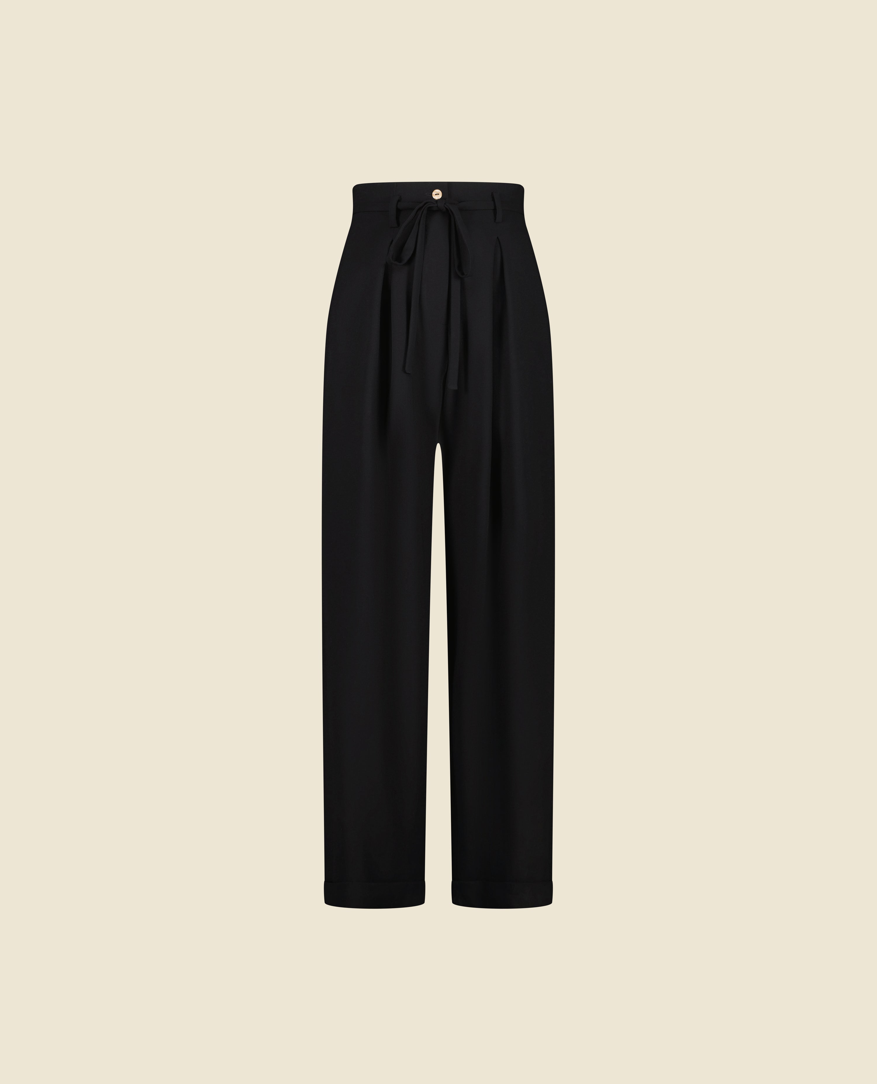 The Tie Waist trousers are a tailored style with a high structured waistband and wide, fluid legs. The waist can be adjusted using two ties that cross at the back and knot at the front.
