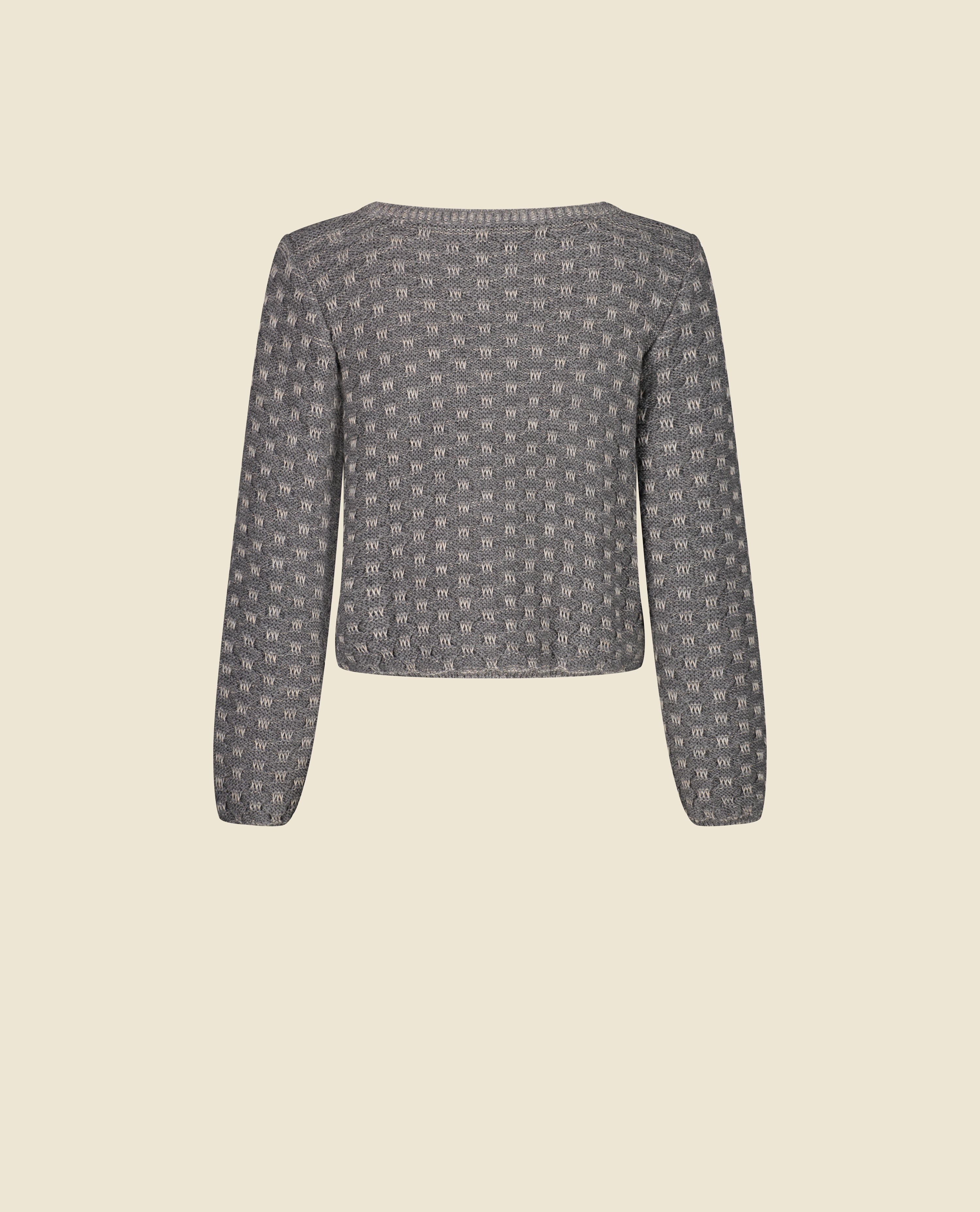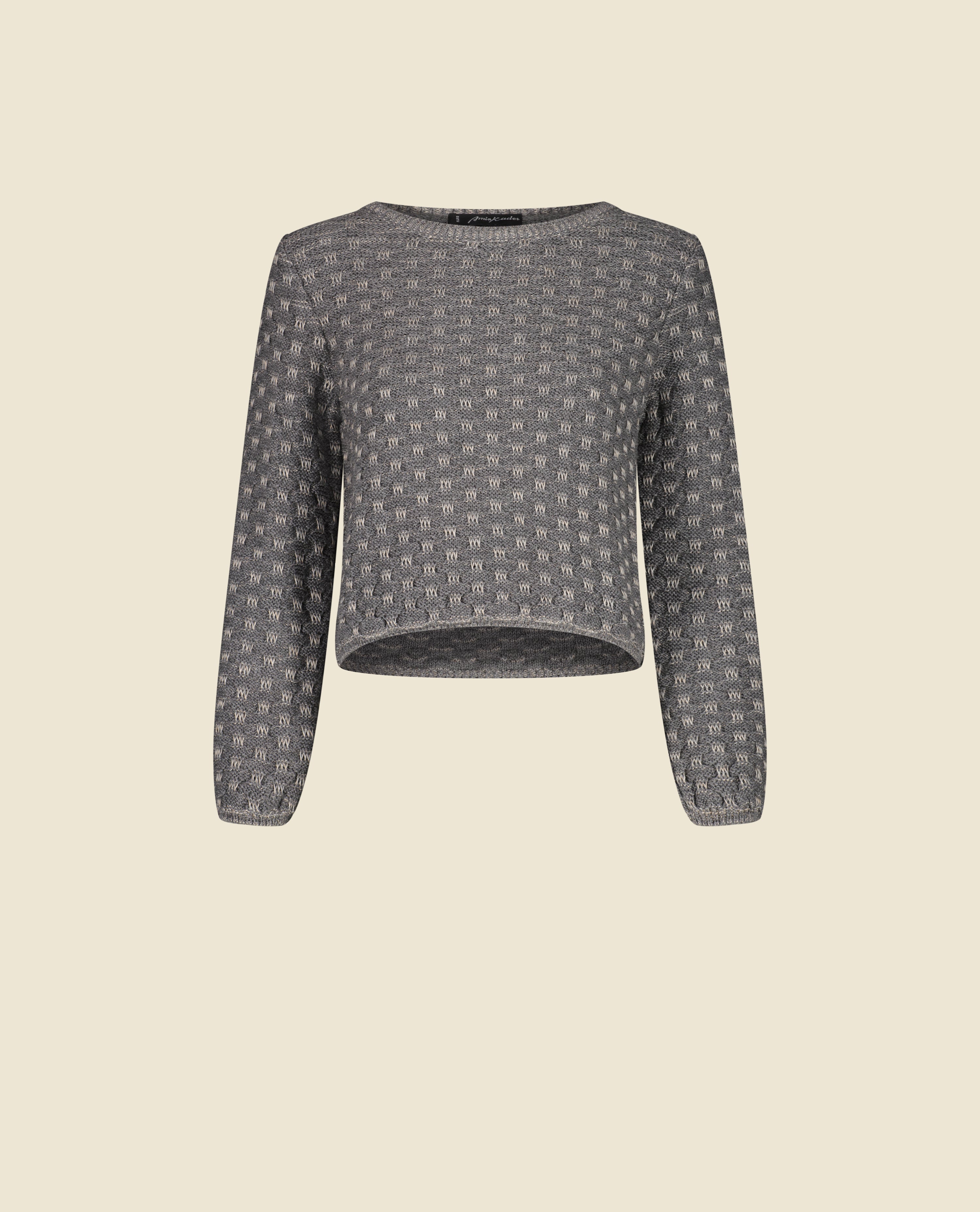 The Écume sweater is a unique creation, entirely crafted with hand-finished details, combining comfort with delicate elegance. Knitted in a wave pattern with contrasting colors, this cropped piece subtly evokes the wild beauty of sea foam through a striking visual effect.