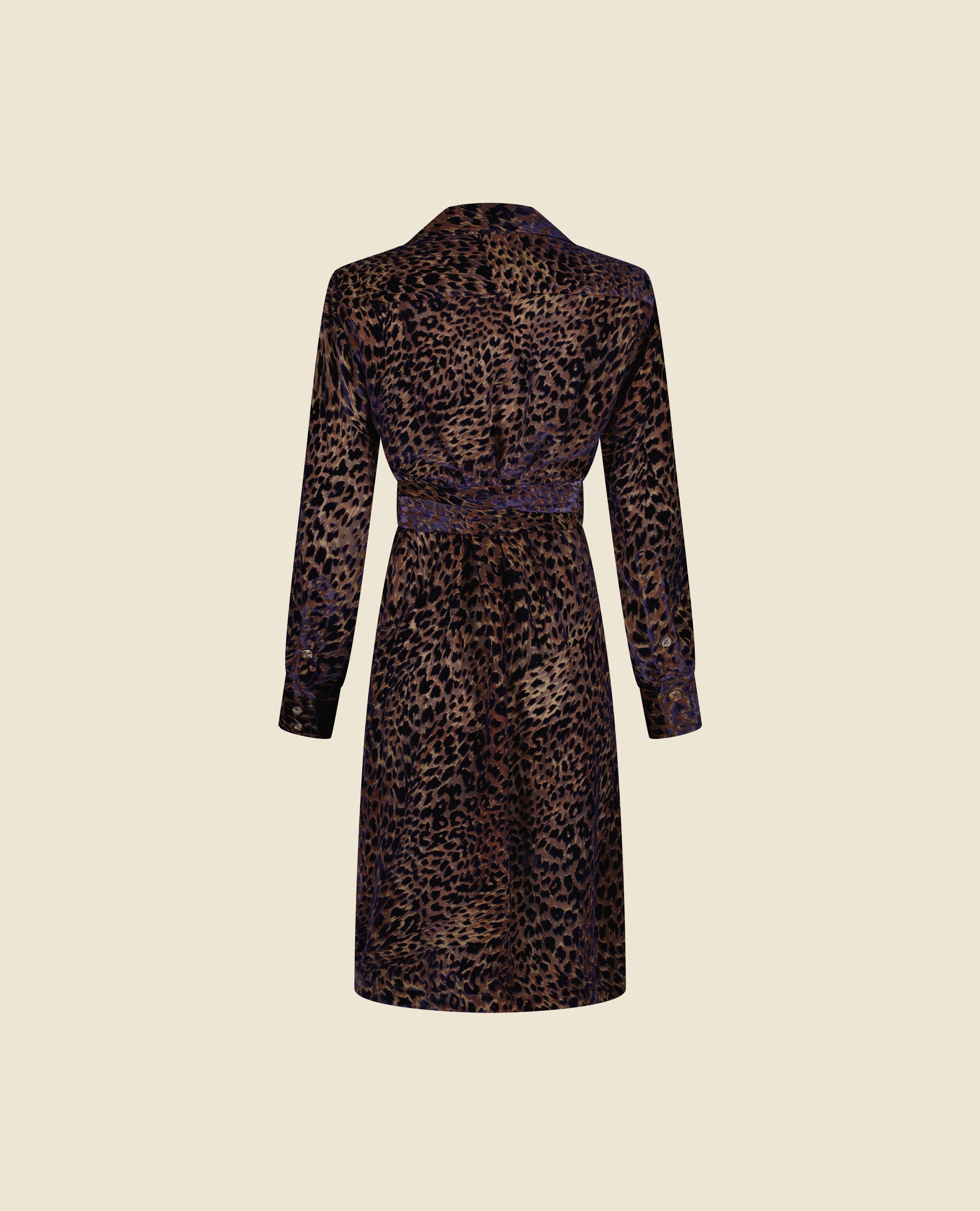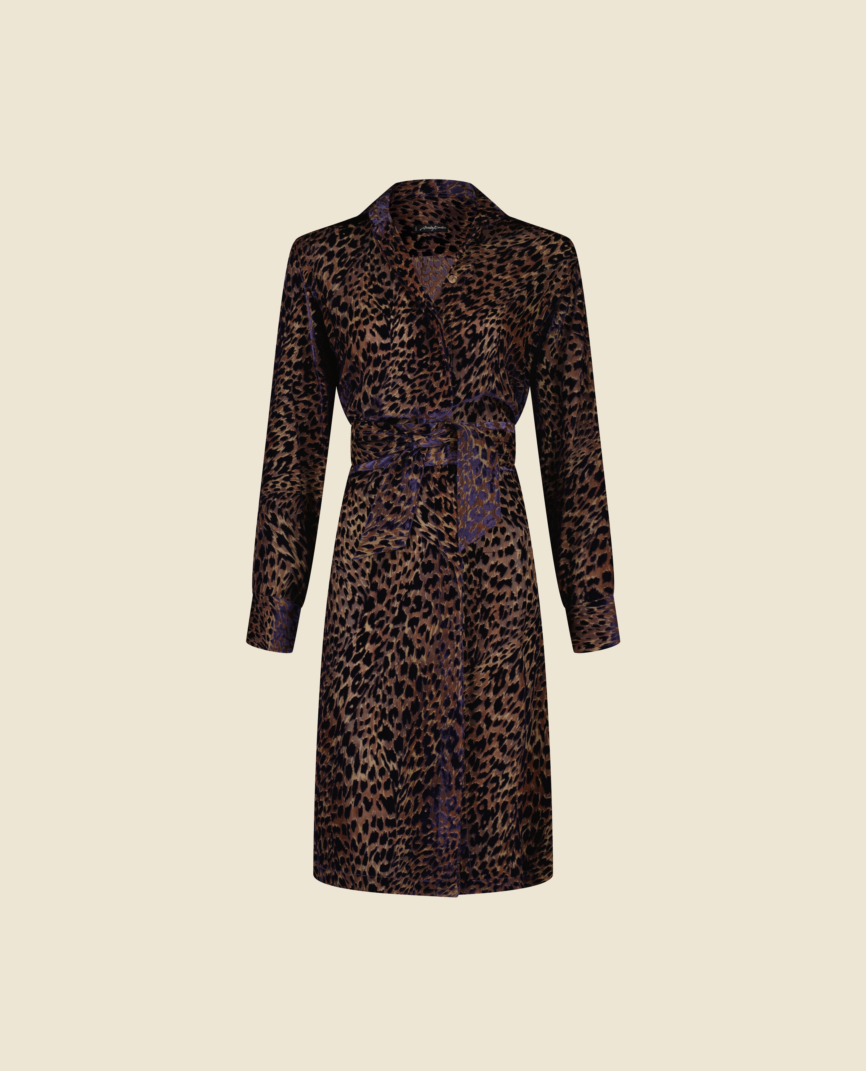 Burnout velvet on silk, adorned with a panther motif, reveals subtle nuances depending on the light. This rich fabric perfectly contours the body’s lines with extreme softness and a second-skin effect. The refined blend of materials creates a unique, durable piece of superior quality.