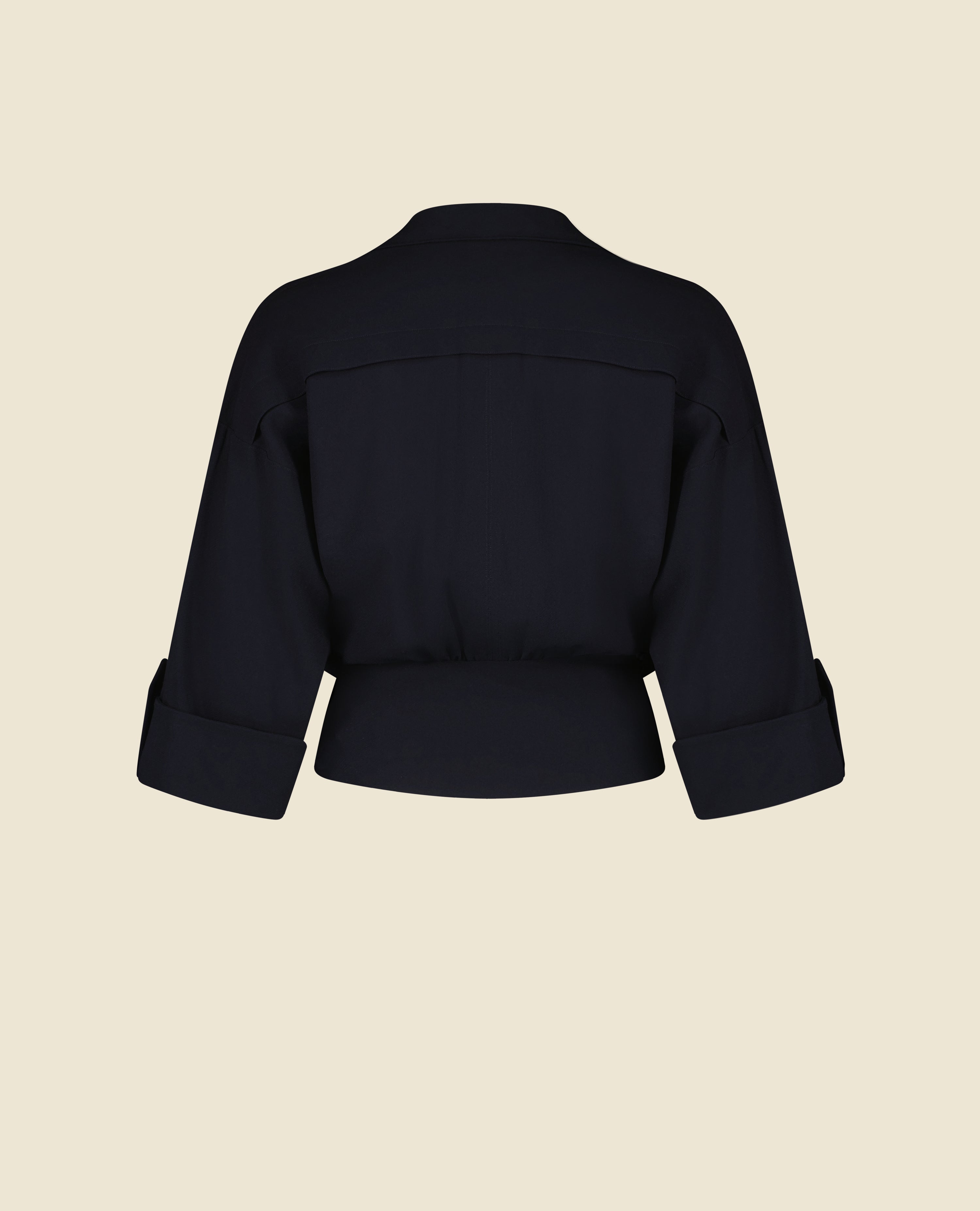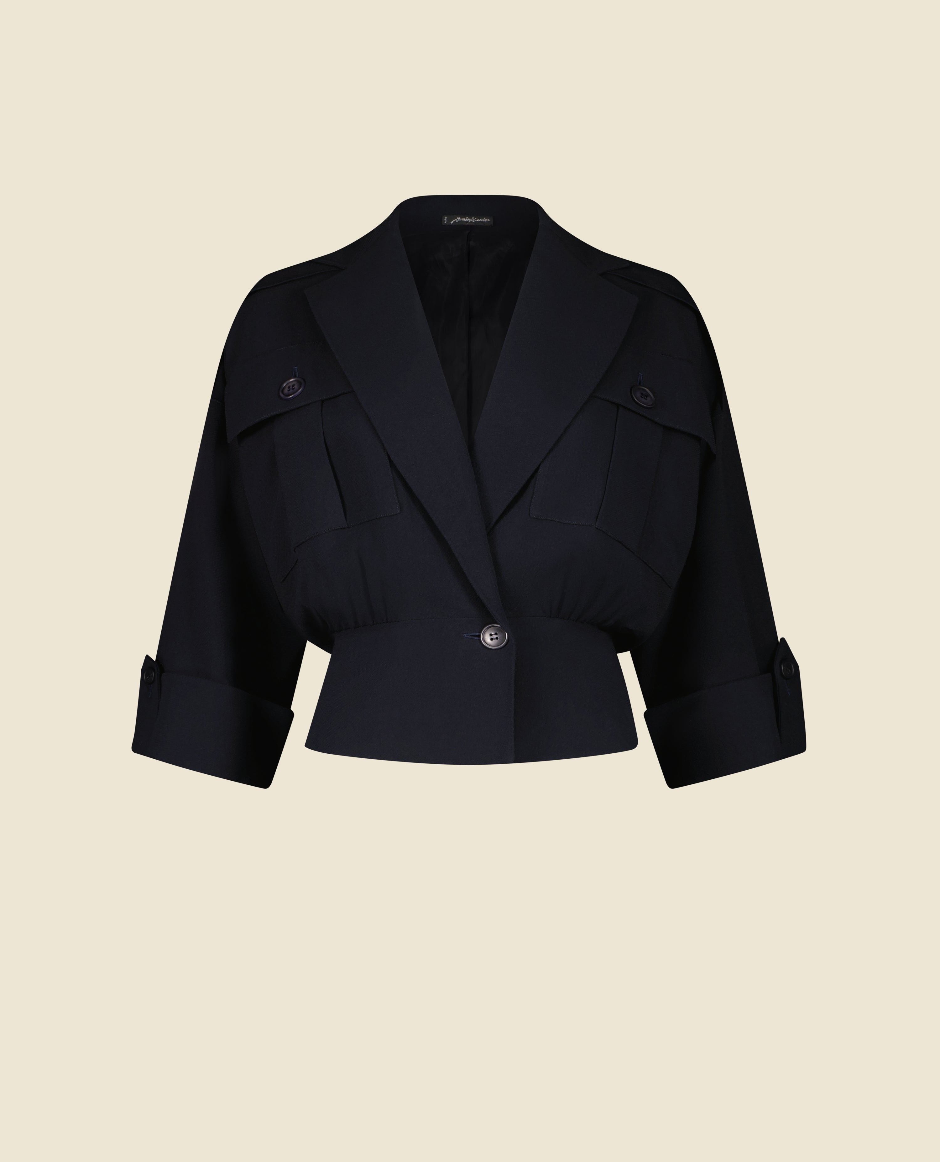 The Moira jacket is an iconic piece in the Amin Kader wardrobe. This timeless model, designed in the 80s, and imbued with simple sophistication, features a rounded shoulder and a fitted cut with double flaps. Featuring three-quarter sleeves and buttoned lapels, this model takes up military codes revisited with finesse.